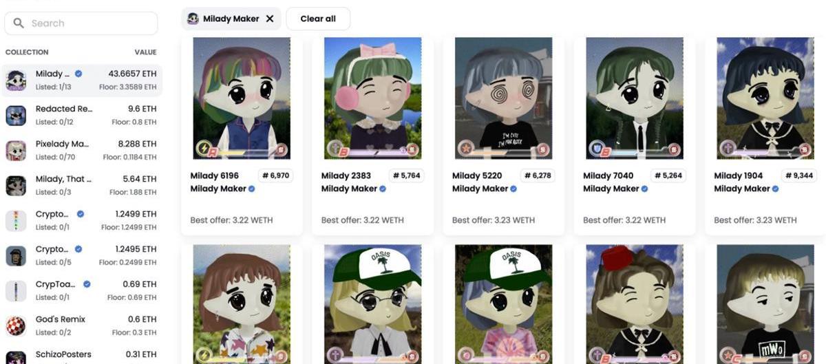 通過分析大量頭部的PEPE的持有地址,發現大量早期購買者均持有一種NFT——Milady。