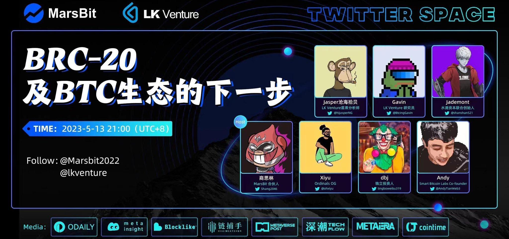 5月12日21時,LKVenture聯合MarsBit舉辦一場TwitterSpace活動,主題:「BRC-20及BTC生態的下一步」。MarsBit合伙人商思林作為此次線上對話主持人,與來自機構、加密社區、投研方向的builders,共同圍繞BRC-20行情、比特幣生態建設相關話題展開討論,分享觀點。