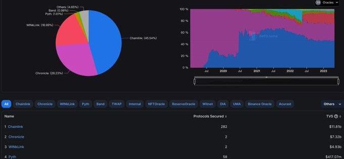 隨后其他預言機品牌也開始誕生,但是除了Chainlink和Chronicleoracles外,作為預言機三巨頭之一的WINLink,依托于波場的龐大用戶基礎和豐富的應用場景,成為了波場生態的獨立地位,這也就意味著,在以太坊上Chainlink幾乎占據了整個通用預言機市場的90%以上,形成了很高的市場壁壘。