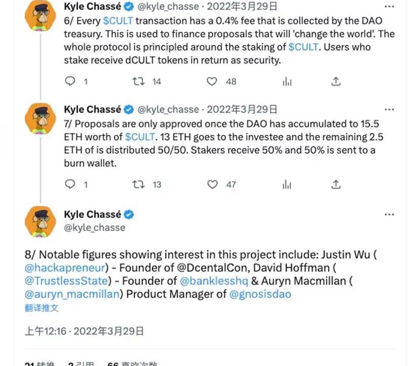 圖片來源:@crypto_TomTom2022年3月小牛行情。幾天暴漲300多倍的去中心化VC項目CultDAO,同樣是通過創始團隊主動郵件聯系推特上的kol們作為CULT守護者完成項目冷啟動。