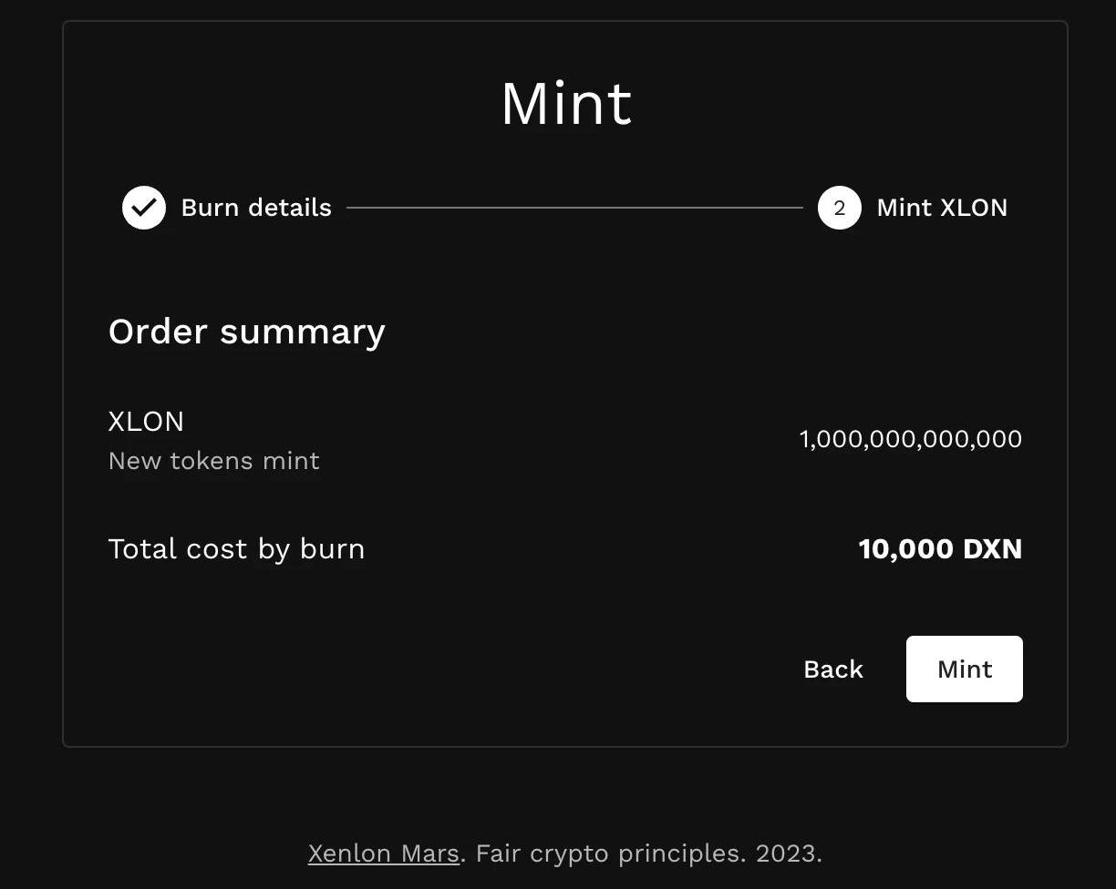 項目鑄造方式也如出一轍的簡單粗暴,燃燒?DXN?即可獲得?XLON。這要是?XEN?生態的第三種原生代幣。