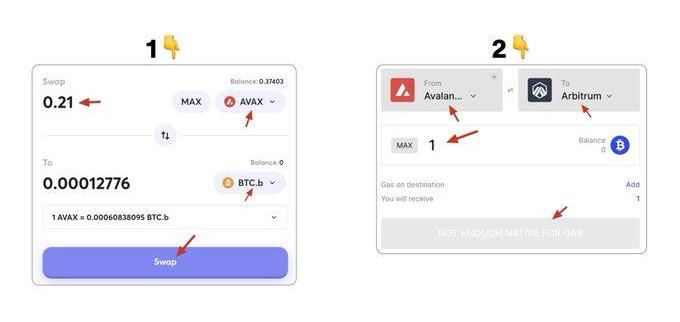 2.BitcoinBridge(1)在Avalanche上使用@traderjoe_xyz交易所購買一些BTCB。(2)使用BTC橋:https://bitcoinbridge.network/bridge從Avalanche跨鏈至其它任何鏈。gas費大約1-2U。