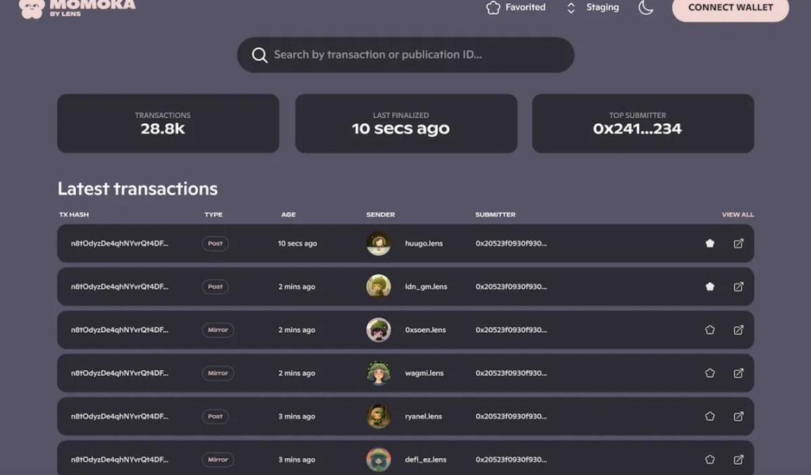 為了更容易找到任何使用Momoka進行的交易,Lens構建了MomokaExplorer來跟蹤和查找Momoka交易,并監測Momoka的吞吐速度。你可以找到交易的所有細節和所有相關數據。MomokaExplorer還允許通過自己的節點驗證交易。