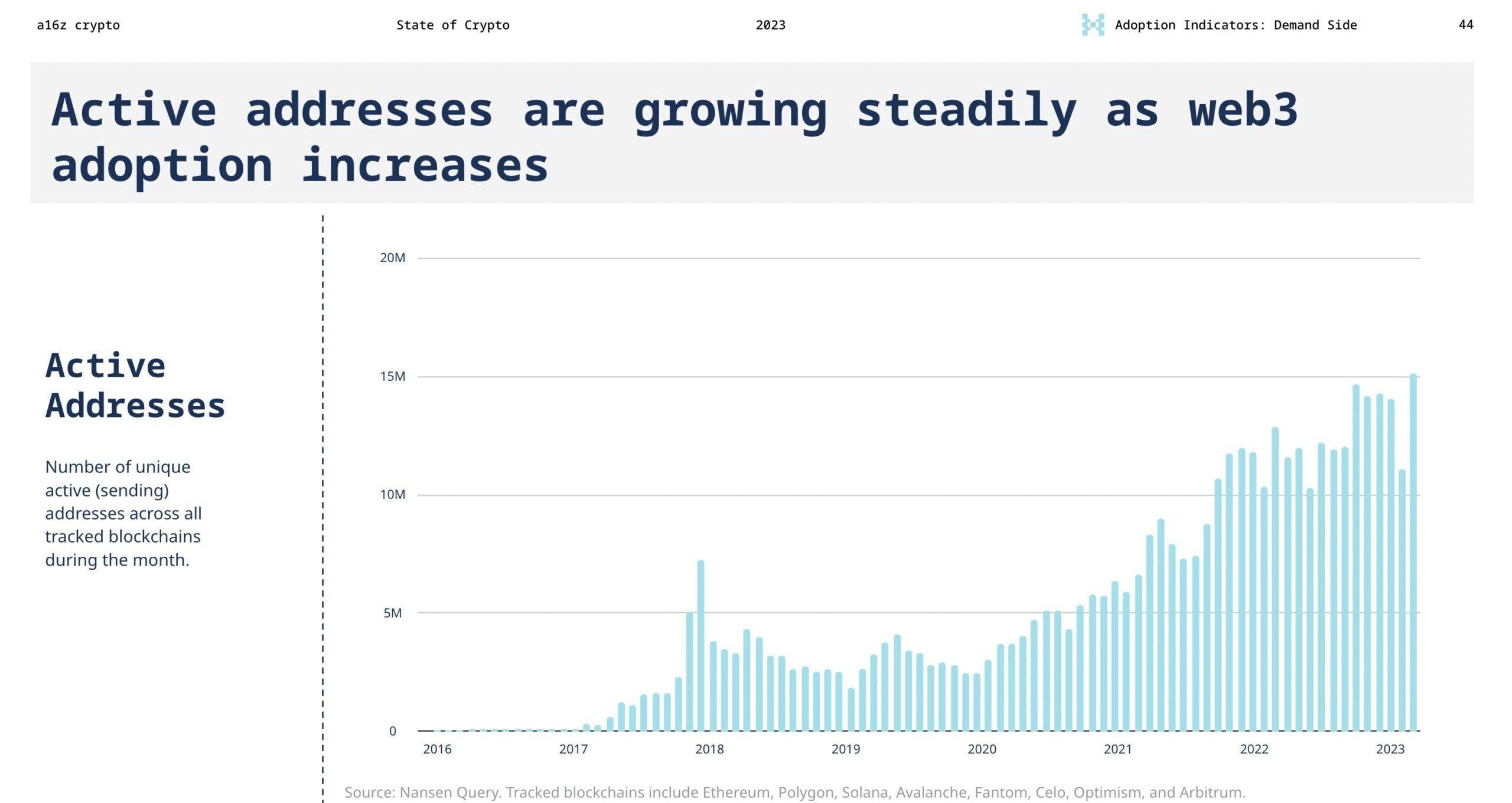 我們的2023年報告旨在解決轉瞬即逝的價格變動的噪音與跟蹤重要信號的數據之間的不平衡問題,包括Web3技術的持久進展。總的來說,報告反映了一個比市場價格可能顯示的更健康的行業,以及一個穩定的發展周期、產品發布和持續創新。