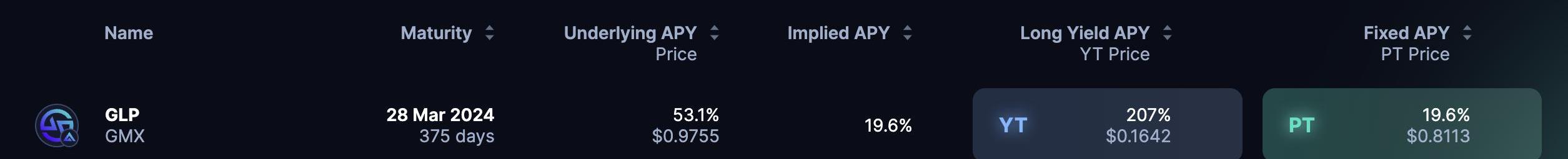 GLP=$0.9755YT=$0.1642PT=$0.8113到期時間=375days也就是說這375天的GLP的收益全歸YT,而PT則可以在375天后的1:1獲取GLP