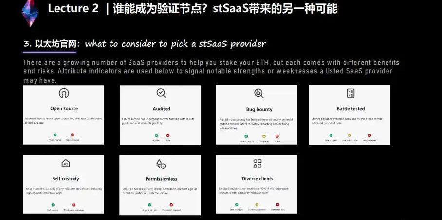 提幣密鑰和質押密鑰相分離,給這些stSaaS的服務商一個可能性——作為一個solostaker,只需要把這個質押密鑰交給這些質押服務商,服務商會去啟動節點去運維。相比于solostaker來說,找stSaaS服務商是一個次安全的方案。因為質押密鑰是給服務商的,但是這樣就把運營的義務和懲罰的風險給轉移到了驗證者的身上,如果說你選擇了一家不那么好的質押服務商,就可能會有損失。比如服務器的離線造成的驗證者的損失,或者他運營得不好,甚至出現雙重投票的問題,就會承受一個slash的風險。所以stSaaS相對solostaking而言是有一定的風險,因此選擇一家安全可靠的質押服務商是一個非常重要的問題。