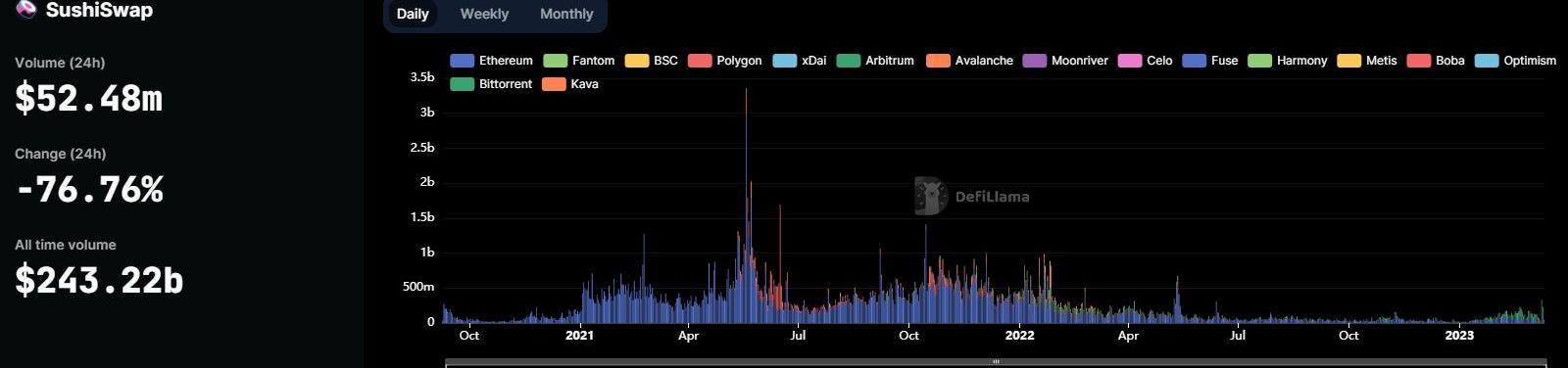 不過根據DeFiLlama數據,此前一周SushiSwap的日均交易額并未出現較大幅度增長,本文撰寫時過去24小時交易額為5248萬美元,反而下降了76.76%。