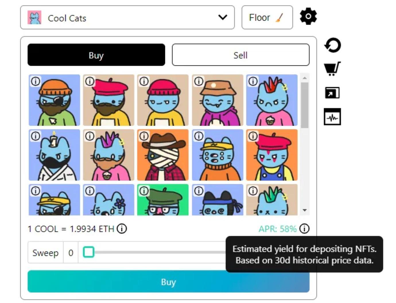 Caviar的LP從每筆NFT交易中收取1%的費用。隨著越來越多的人通過一個特定的資金池進行交易,該資金池的LP相應地可以賺取更多的收益。那么,這里的策略是用ETH和NFT在活躍的Caviar池中做LP,從長期的交易活動中獲利。例如,你可以在下圖中看到,根據過去30天的交易活動,Caviar上的CoolCatsLP目前正在賺取58%的年利率。
