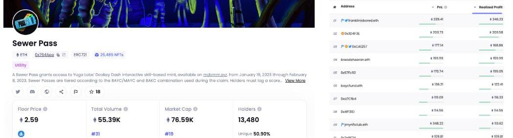 除了游戲數據,作為DookeyDash入場券的SewerPass也在NFT市場取得了相當不錯的成績,發行之后價格從0ETH漲至最高2.89ETH,累計交易量達到55.39kETH,這讓SewerPassNFT的市值短時間超過了1億美金。許多Flipper也因此獲利,下圖收益排行榜展示了前10名的具體盈利情況。