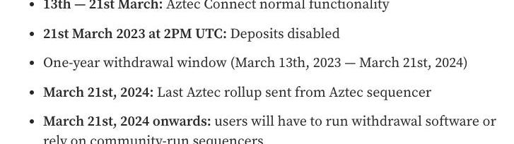 AztecNetwork補充表示,提款功能仍將持續開放1年,預計直到2024年3月21日才會徹底放棄?AztecConnect合約并停止運行Rollup排序器,但仍建議用戶盡快提取資金。