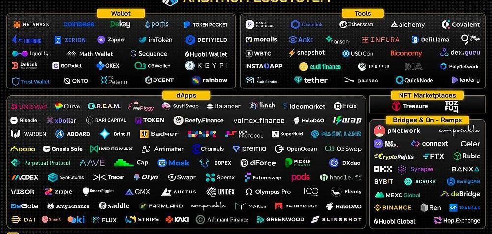 自2021年8月Arbitrum推出以來,該生態系統呈指數級增長,許多項目已經啟動并遷移到該網絡上。Arbitrum已經超越了BinanceSmartChain,在日常和周交易量方面排名第二。但是,總鎖定價值仍然低于以太坊、BinanceSmartChain和Tron。Arbitrum團隊巧妙地利用了空投的猜測,保持了熱度,提高了交易量和交易次數。