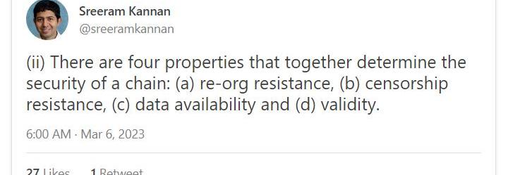 圖:決定一條鏈的安全性有四大特點:抗重組,抗審查,數據可用性以及有效性。