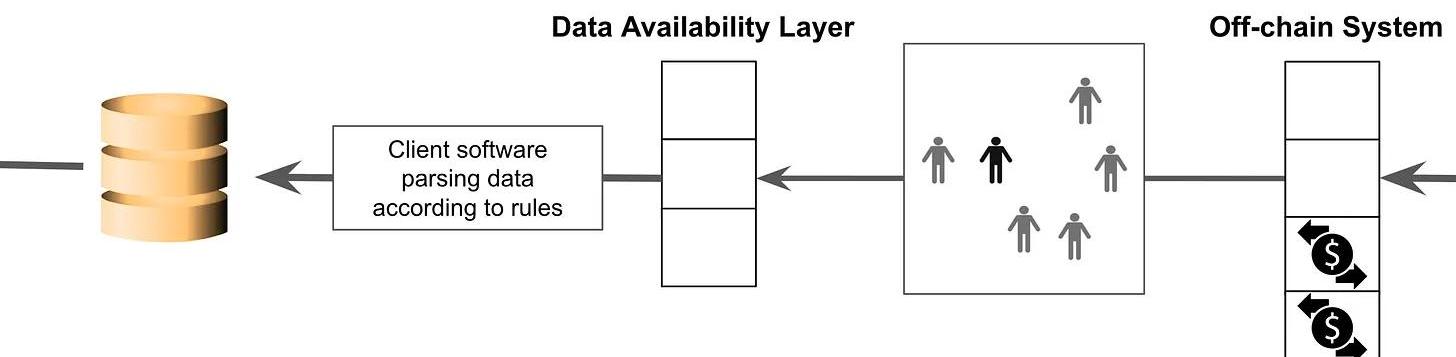 圖:用戶將把他們的交易發布到數據可用性層,客戶端軟件根據全球范圍商定的規則集解析這些數據,以計算鏈外數據庫。