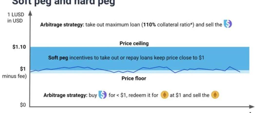 110%的最低抵押率創造了1.10美元的自然價格上限。當LUSD:USD匯率超過該水平時,套利者可以通過以其抵押品借入最大金額并在市場上以超過1.10美元的價格出售LUSD來立即獲利。
