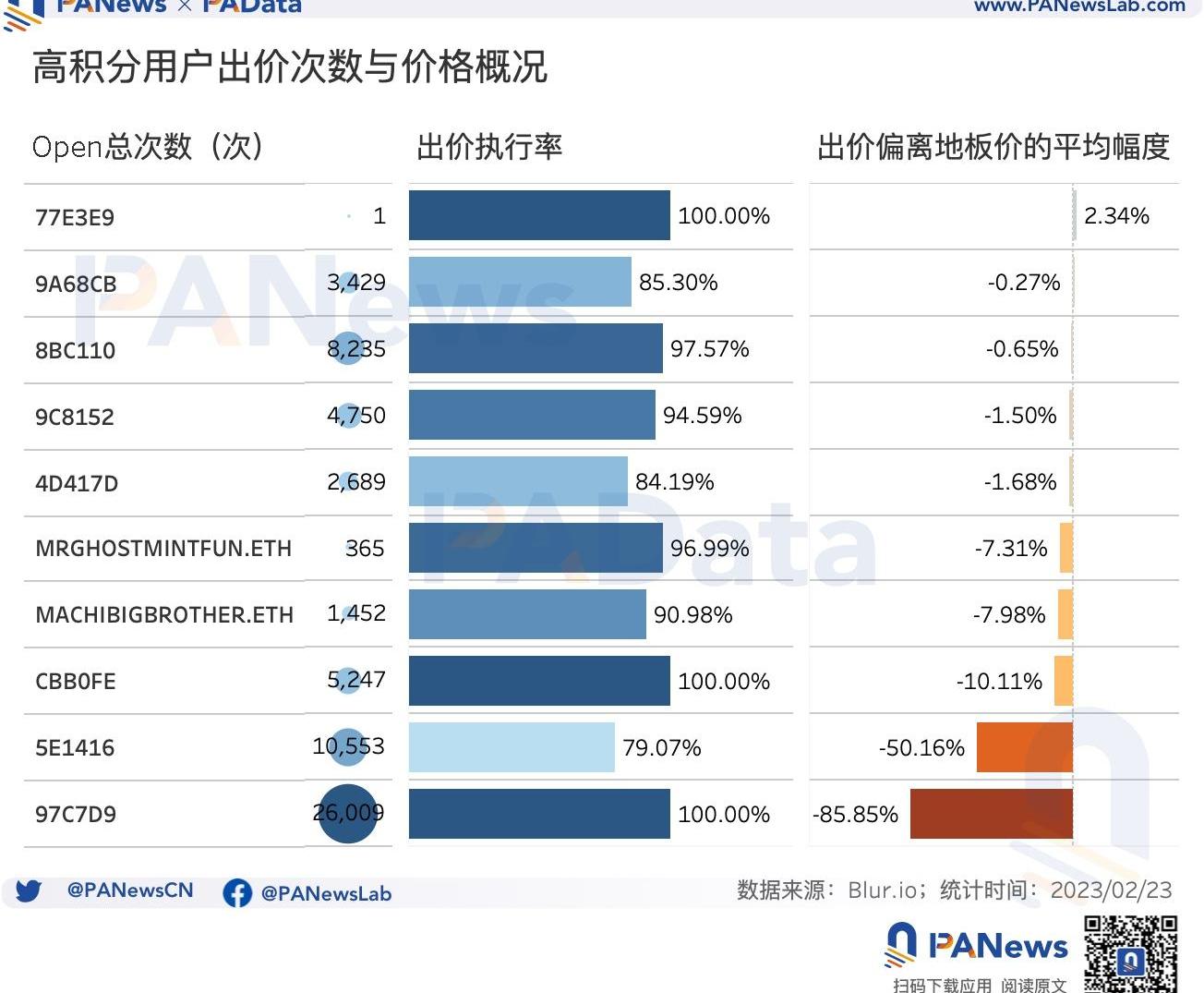 從更微觀的?Bidding?行為來看,?10?個高積分用戶有效出價總次數約?6.27?萬次,平均出價偏離地板價的幅度約為-16.32%?,平均出價執行率約為?92.87%?。但是,不同高積分用戶有效出價次數和出價偏離地板價的幅度有很大差異。