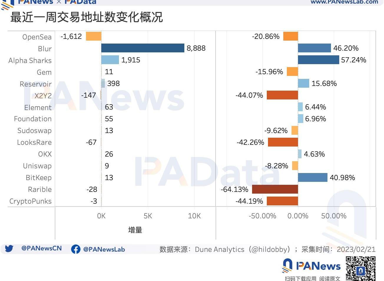 PAData?統計了?Blur、OpenSea、LooksRare、Gem、AlphaSharks、X2Y2、Reservoir、CryptoPunks、Sudoswap、Foundation、Element、OKX、Uniswap、Rarible、BitKeep?共?15?個交易市場本月以來的交易情況,從數據結果來看,多個交易市場的交易量交易地址數均有明顯增長,Blur?刺激了新的交易需求,一定程度上做大了“蛋糕”。