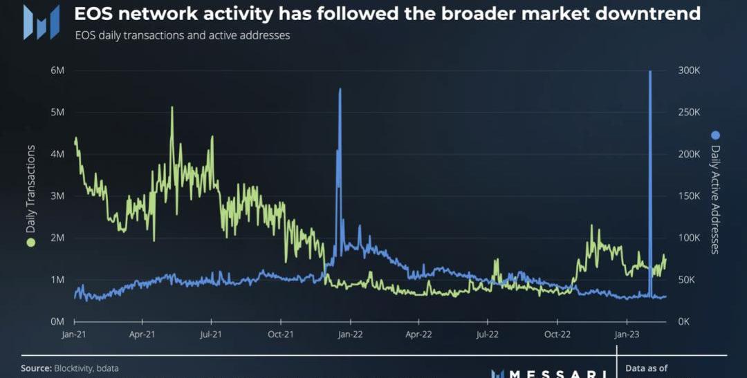 年初至今,該網絡平均每天有130萬筆交易和38,000個每日活躍地址。然而,后一個數字被一個大的異常值夸大了。2023年1月31日,每日活躍地址激增至436,000。峰值沒有明確的原因,ENF不確定是什么導致了它。幾乎整個激增是由于地址與EOS系統合約交互——它管理委托、資源管理等功能——而不是任何與dapp相關的活動的增加。