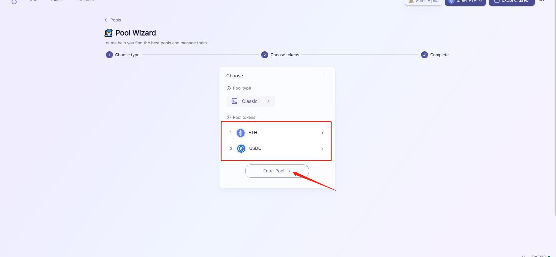 左邊選擇ETH,右邊選擇USDC,手續費選擇1%,范圍設置成全范圍