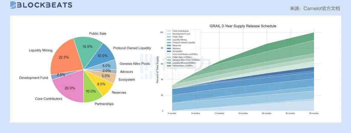 Camelot基于GRAIL和xGRAIL雙幣系統。GRAIL總供應量10萬枚,xGRAIL則是不可轉讓的治理Token,兩者均可以用于DeFi耕收。GRAIL的大部分供應量都以xGRAIL的形式排放,從而對市場上的供應量進行高度控制。協議的收益則主要來自交易費,并將部分以實際收益的形式重新分配給xGRAIL持有者。