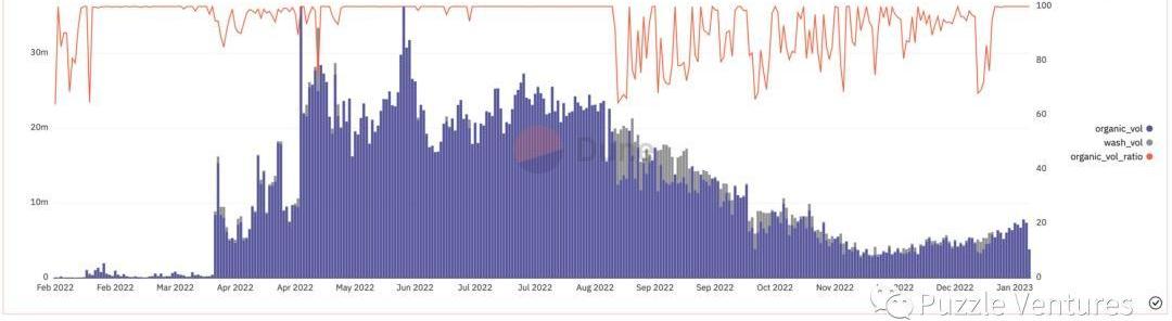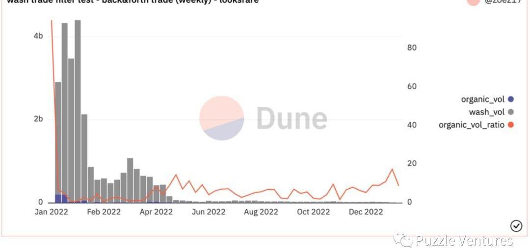 以日為單位(上)和以周(下)為單位用“第一層過濾器”對X2Y2市場表現進行過濾。后者對近期的過濾效果更好,同時也沒有丟掉前者過濾掉的洗售交易。(Source:Zoe’sDuneDashboard)