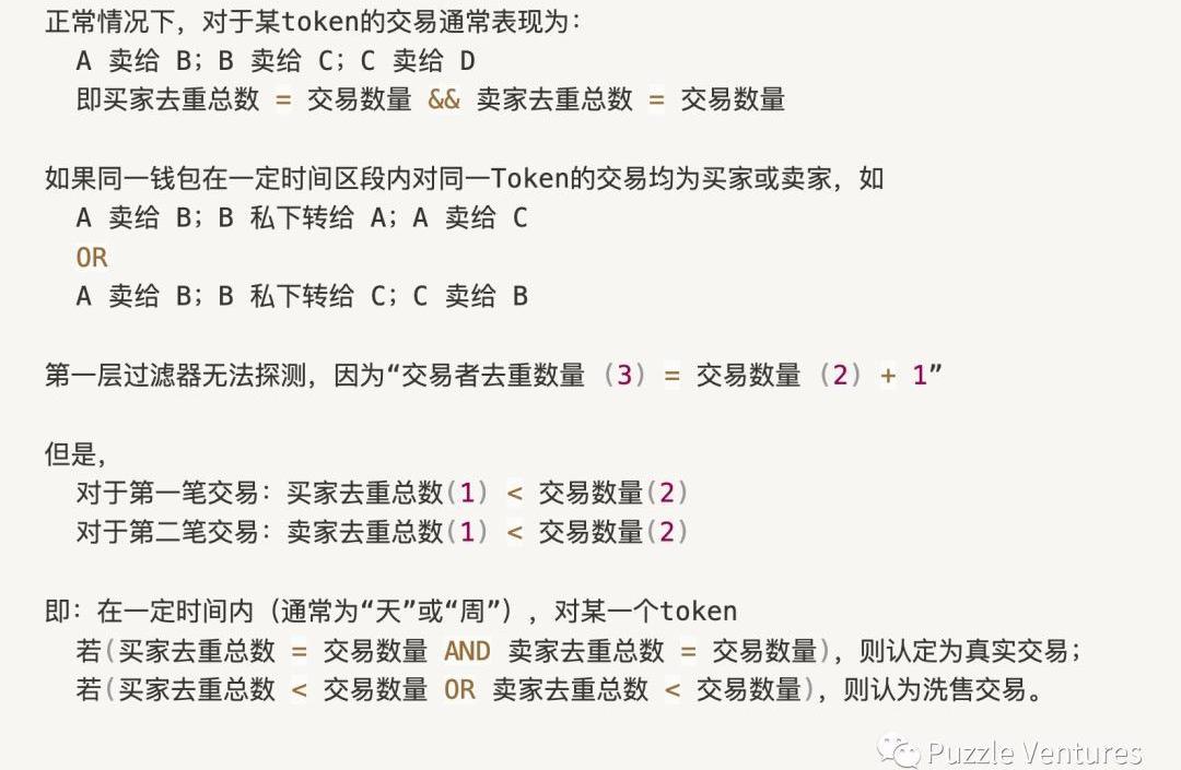 我們發現以上第1、2、3類洗售交易中,都涉及到在關于某token的一個或多個一連串交易轉賬中,同一個人出現了超過一次。也即: