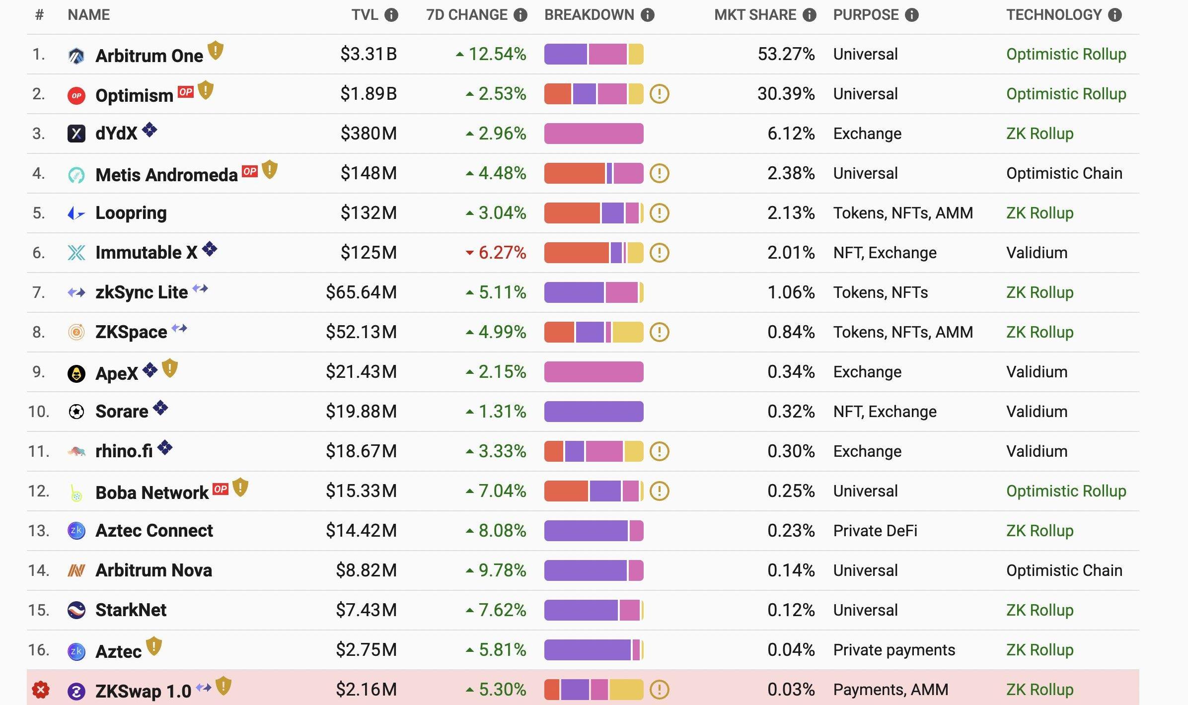 接下來讓我們一起看看Layer2的競爭格局和主要玩家,從Layer2的TVL占比來看,前十的玩家是Arbitrum、Optimism、dydx、Metis、Loopring、ImmutableX、zkSync、ZKSpace、ApeX和Sorare,包括optimistic、zk和validium這三類。