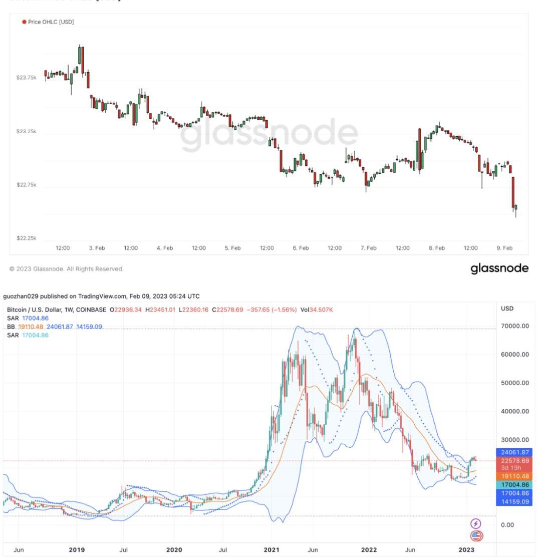 貨幣流動性趨緊。雖然本周鮑威爾講話鴿派,承認美國通脹開始下降。但是市場擔心超預期的強勁就業數據,會提升利率峰值至6%,比現有預期還高1個百分點。美元指數大幅上漲,短期對風險資產的反彈形成壓制。美股恐慌回調,但上漲趨勢并未破壞。Crypto市場主要跟隨美股調整。