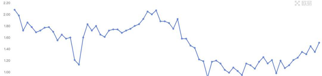 期貨多空比:1.5。散戶做多情緒升級,散戶情緒多為反向指標。多空比數據波動大,參考意義有所削弱。