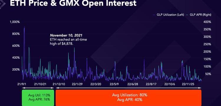 GMX15個月的歷史可以分為兩個部分。第一階段從2021年9月1日到2021年11月10日,是一個短暫的牛市,ETH沖到了歷史高點。從2021年11月10日起的第二階段,是漫長而痛苦的熊市,ETH下跌了70%以上。