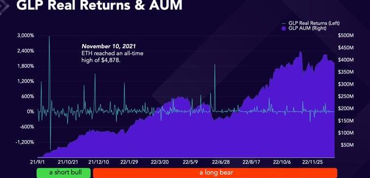 在GMX發展的第一階段,也就是牛市中,GLP的AdjustedAPR經常為負值,但AUM卻持續增長。