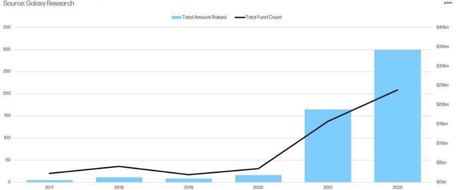 然而,按全年計算,2022年仍然是加密VC籌款規模最大的一年,200多家基金籌集了超過330億美元的資金,相比2021年140家風險基金籌集的194億美元,2022年增長非常顯著。