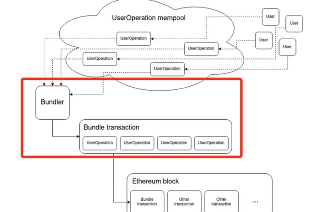 賬戶抽象想實現的就是繼續以CA智能合約為錢包載體,但是盡量弱化EOA的必要性。其實解決思路其實就是在用戶和CA之間加一層“代理”,由代理方幫助用戶完成“觸鏈”過程,如下圖是V神寫的文章中對賬戶抽象的架構設計,中間加了一層Bundler概念,建議大家閱讀原文: