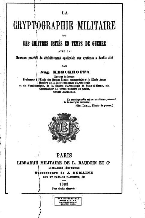 1883年初,柯克霍夫在《軍事科學雜志》上發表兩份題為《軍事密碼學》的報告,一舉奠定其在現代密碼學上的先驅者地位。時至今日,密碼學與網絡安全領域的學術專著與論文仍然在引用柯克霍夫的力作,Twitter、Medium、Reddit等社交平臺上依稀可見柯克霍夫的身影。這些文獻引用的大多是柯克霍夫在《軍事密碼學》中提出的關于密碼安全系統的六項原則: