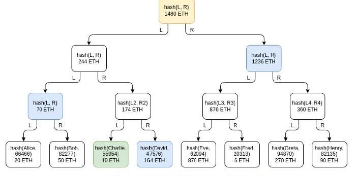 ●生成默克爾樹證明:交易所委托外部審計公司或由其本身對所有用戶余額進行快照,然后將其匯總至默克爾總和樹。