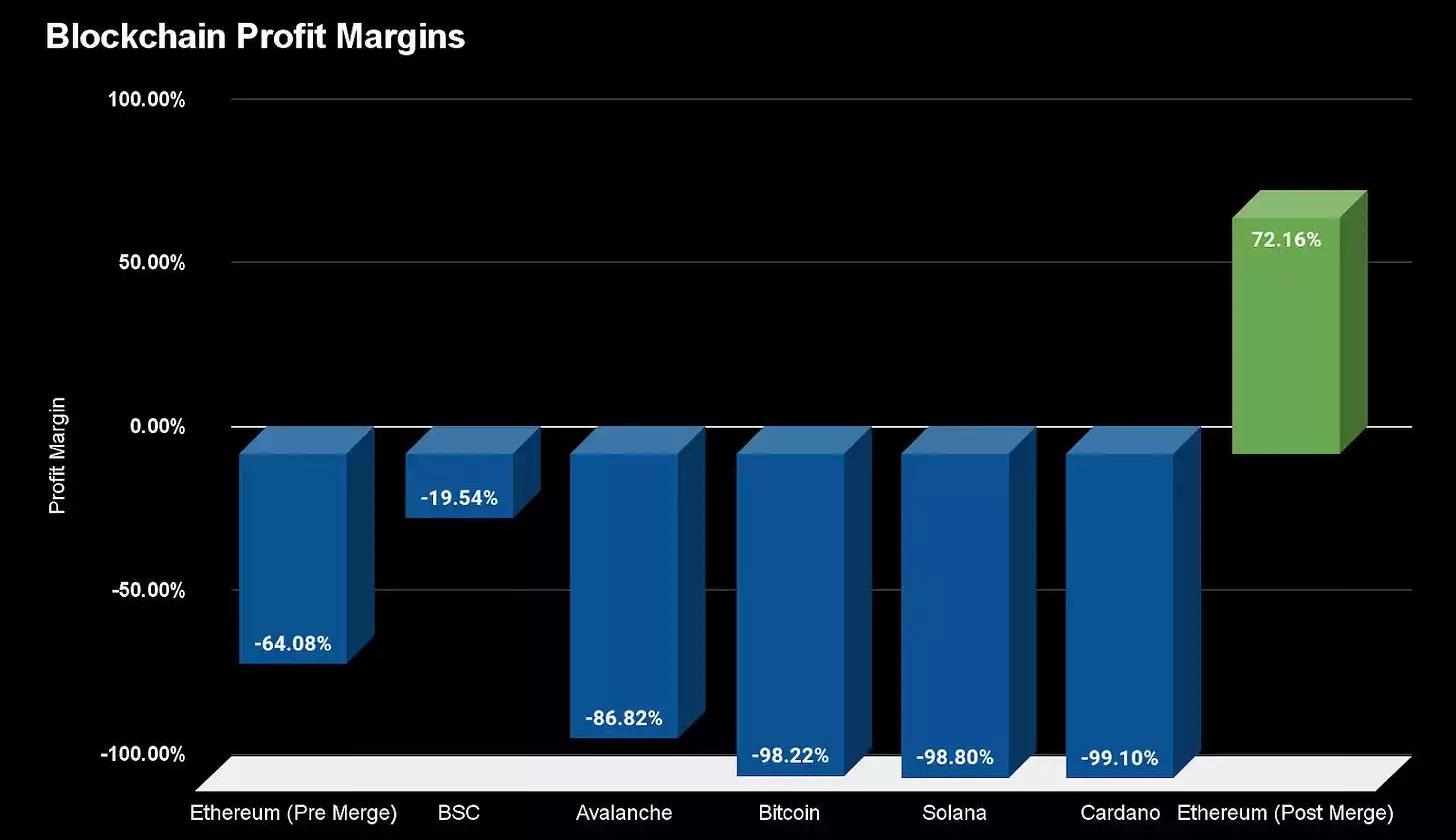 在本報告的后面,我將介紹其中的一些術語,尤其是分片和EIP-4844,這是向Ethereum的最終目標邁出的一小步。從下圖中我們可以看到,合并后的Ethereum是唯一一個能夠產生正利潤率的L1——其他鏈都望塵莫及(除了BSC,但我會讓@0xGodking來處理這件事)。