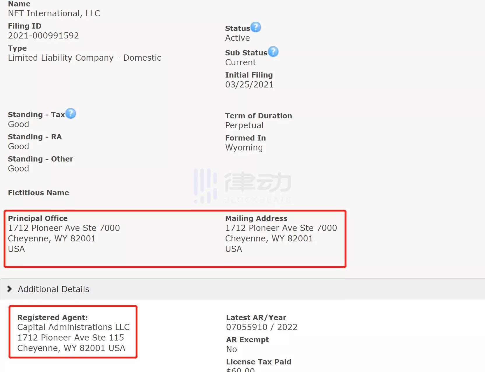 實際上,NFTINTLLC是一家由WyomingCorporateServices注冊的「影子公司」。在監管不嚴的懷俄明州,WyomingCorporateServices是提供「影子公司」建立服務的專家。
