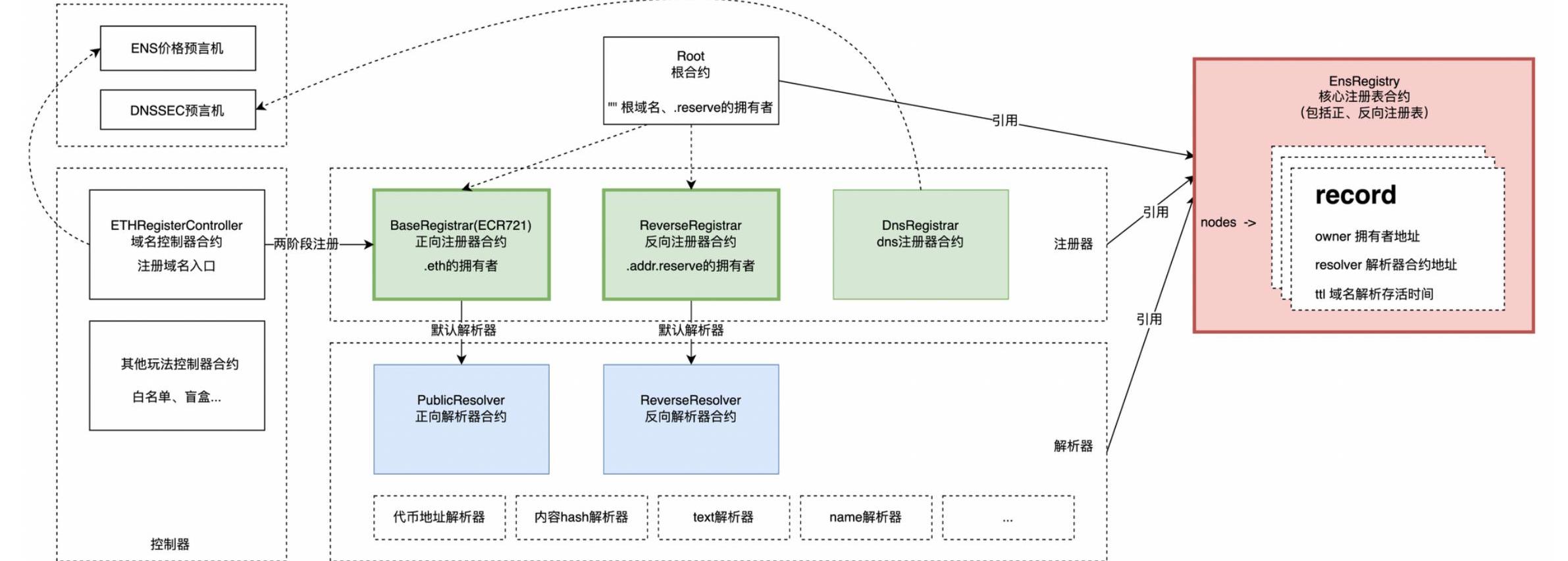 注冊器合約:負責分配名稱的合約,有正向注冊器,反向注冊器,DNS注冊器
