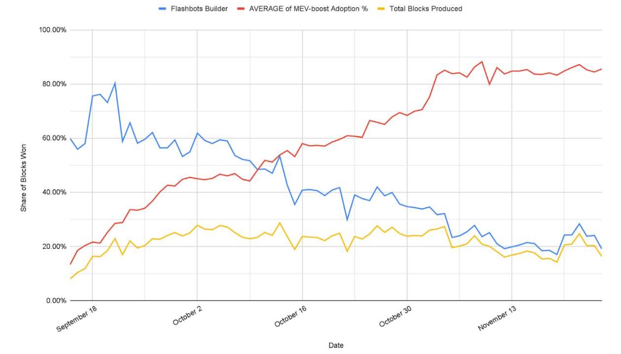 下圖顯示了由Flashbots構建的向網絡提議的MEV-Boost塊的百分比份額,由藍線表示。紅線表示驗證者集對MEV-Boost的整體采用,黃線表示Flashbots構建的區塊占整體采用MEV-Boost的百分比。