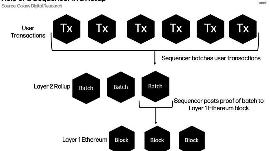 為了提高以太坊的可擴展性,有幾個L2網絡將交易執行從基礎層抽象到rollup.Rollup壓縮交易數據,使得向基礎層提交一批交易所需的區塊空間大大低于通過鏈上的mempool單獨確認這些交易。相較于驗證者或礦工,rollup由被稱為“排序者”的網絡運營商操作。排序器負責驗證rollup的狀態轉換。他們是將用戶交易捆綁成一個rollup批次的實體,然后將這批交易的證明提交給以太坊的基礎層。下面這張圖說明了排序器在rollup中的作用: