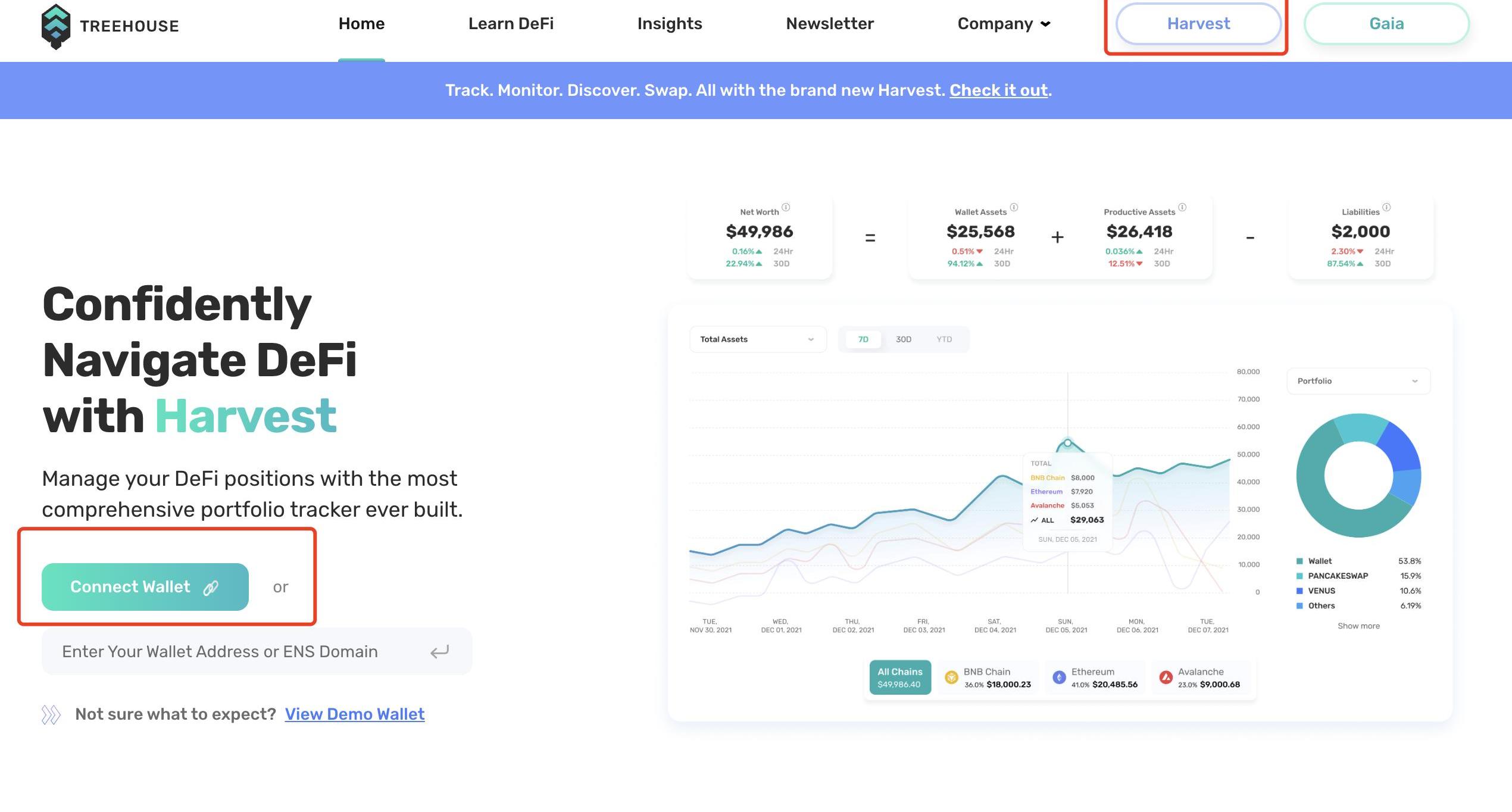 打開官網點擊右上角的主要產品harvest,或者下面的Connectwallet