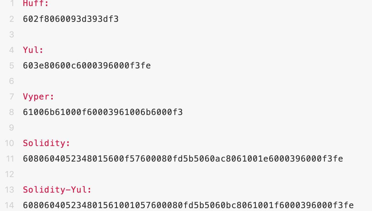 你可能會認為,因為Yul-Solidity的合約創建字節碼所占空間最大而Huff的字節碼所占空間最小,所以Huff最便宜而Yul-Solidity最貴。但是當你復制整個代碼庫并將其發到到鏈上時,代碼庫的大小會產生很大的差異,這才是決定性因素。然而,這個合約創建代碼確實讓我們了解了編譯器的工作原理,即他們將如何編譯合約。
