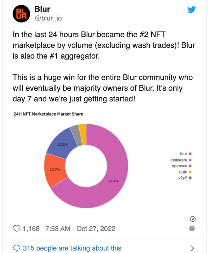 這個新的交易市場在2022年10月19日正式啟動之前,大約有276天處于私人開發階段。Blur的聚合器已經在該領域擁有第二高的交易量。Blur在Twitter上慶祝這一里程碑,說它“成為按交易量計算排名第二的NFT市場!”以及NFT的“第一聚合器”。