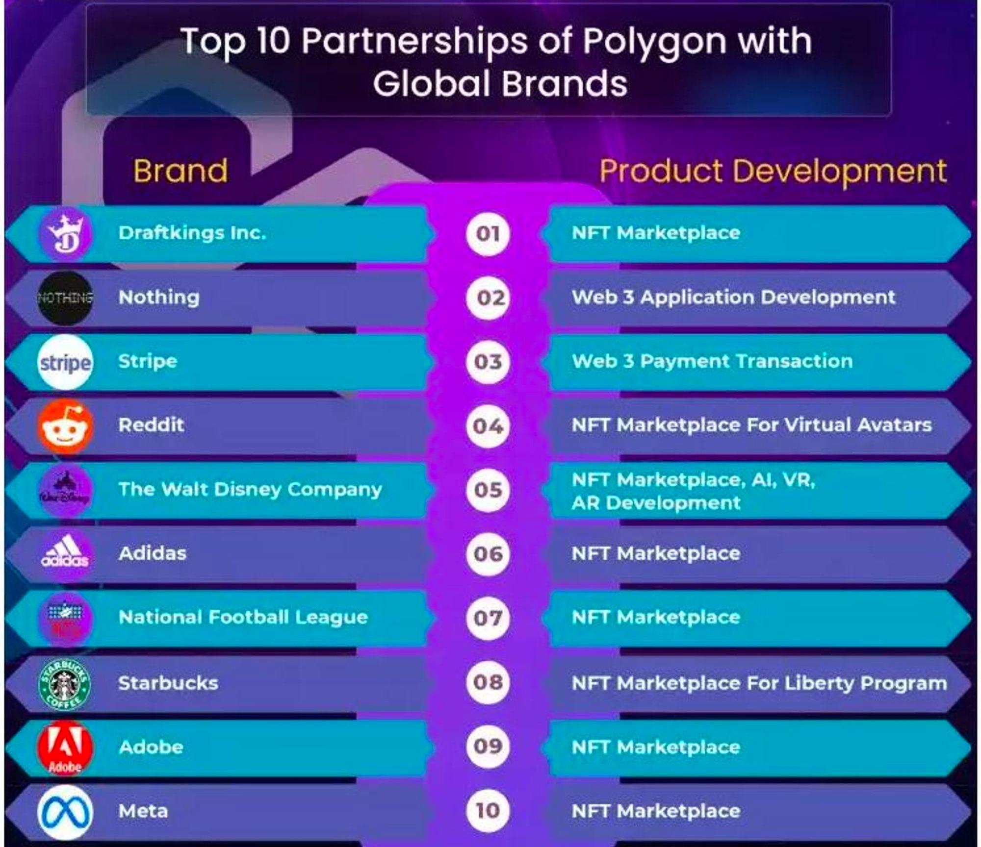 這樣做的主要目的是保持低交易成本且節能。Polygon區塊鏈以其靈活性、可擴展性和低Gas費用而聞名,同時保持了以太坊區塊鏈的優勢。Polygon組織也在引領Web3的大規模采用。它已經與可口可樂、星巴克、Draftkings、Meta等頂級品牌合作,將用戶納入Web3。