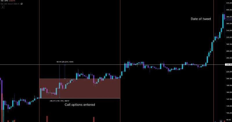 但請記住,Zhu持有一些7月份的ETH看漲期權。它們的行權價為240,每張合約的成本為0.0246ETH。