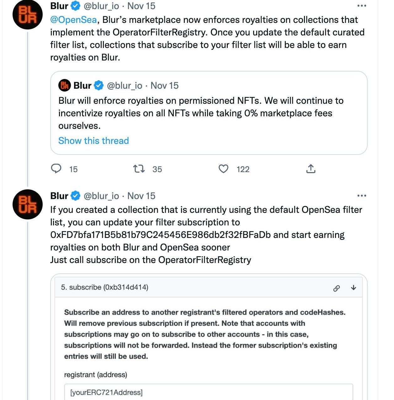 Blur在11月15號,發推特聲明將會執行強制版稅,并且強調建議項目方/創作者使用自己能夠掌控的工具在合約層面進行強制版稅征收,而不是使用Opensea的強制版稅工具。