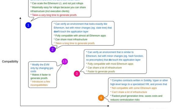 Vitalik曾給出不同的EVM分類的兼容性和性能表現關系,可以發現,越底層的實現兼容性越強,但其性能表現則會越差,這個道理其實很簡單,聯想下以太坊主網那可憐的性能和極強的安全性便可明白。