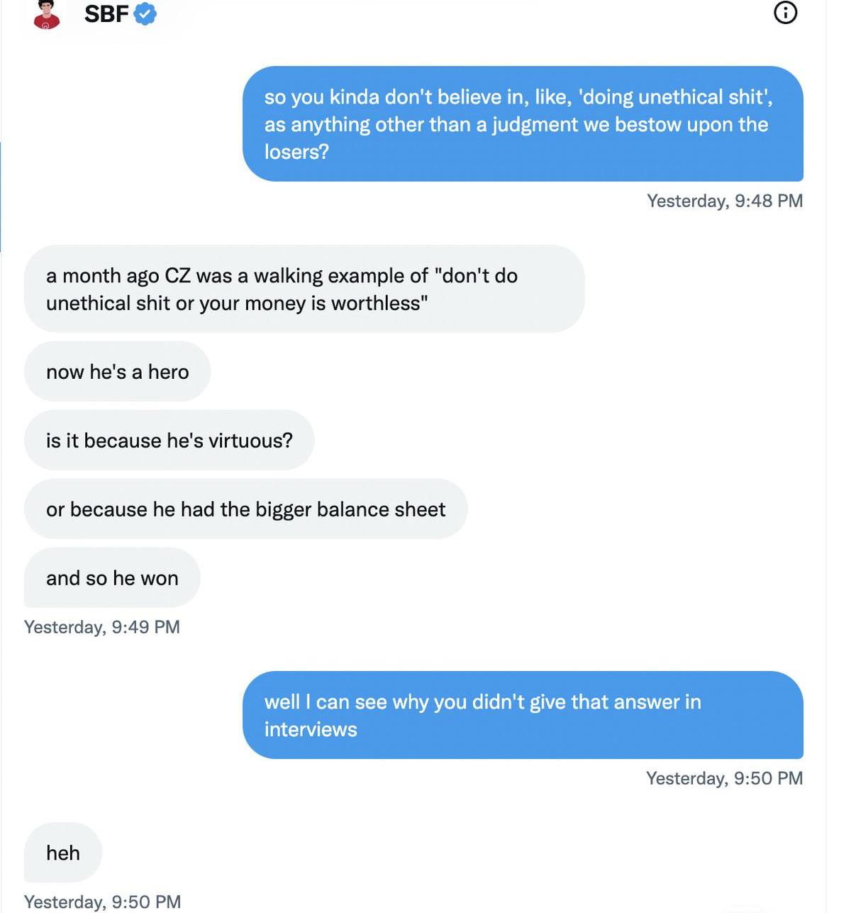 上述問題恰好是我在今夏采訪時問過他的,在我們推特對話的前一天晚上,我恰好又看到這一問題。當然,當時我認為SBF可能越界的道德困境首先是經營加密貨幣交易所是否可以接受——以及他聲稱打算做的好事是否可以接受。