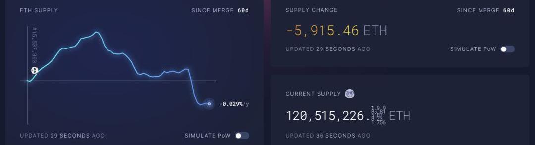 在以太坊60天之際,根據ultrasoundmoney提供的數據顯示,以太坊網絡已經減少了5915.46ETH的發行量,已經處于通縮狀態。可一起來看看此前期待的EIP1559+POS低通脹帶來的“3倍減半/通縮”到底起效了沒有?