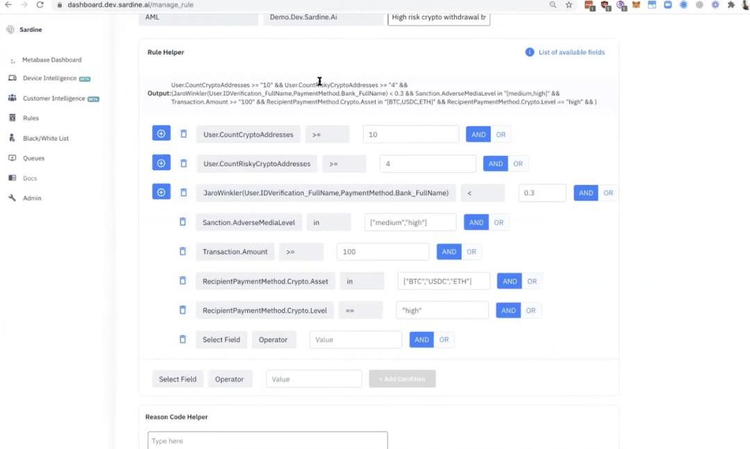 Sardine可以讓公司檢測最復雜的賬戶接管,包括撞庫攻擊、SIM卡交換、電子郵件和短信釣魚等;Sardine的多因素編排可以讓公司盡可能地在無摩擦地情況下額外驗證用戶身份。最終,客戶可以通過Sardine提供的Dashboard來實時監測各類設備、客戶和交易信息,并且可以無代碼地配置交易監控的相關規則——甚至是Crypto?相關的。