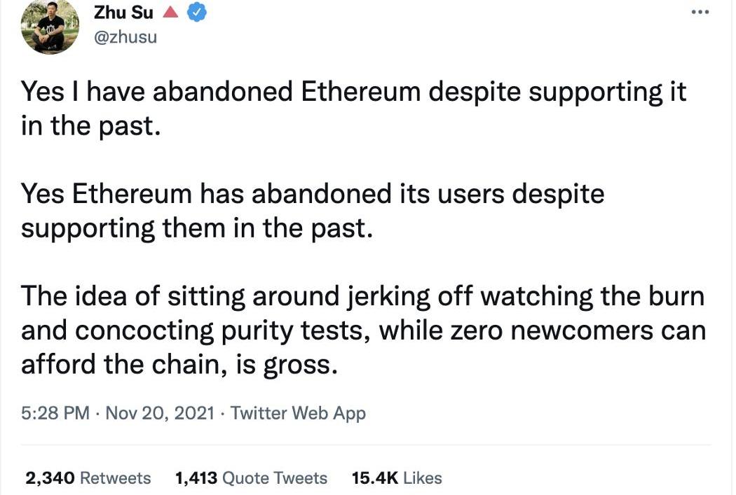 上面的推文完美地概括了許多人在2021年對以太坊的核心情緒和挫敗感。他們被定價并認為以太坊社區并不關心他們,而是更關心圍繞去中心化、自我驗證和貨幣溢價。根據您的參考框架,有些人會稱之為“與現實脫節”,而另一些人會稱之為“不同的優先事項”。